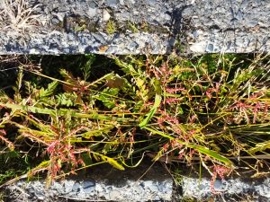 お店の駐車場のすき間や道端に、様々な植物が生えています。