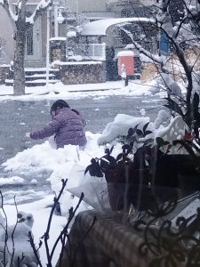 雪で遊びたいおチビちゃんと早く帰りたいお父さん。